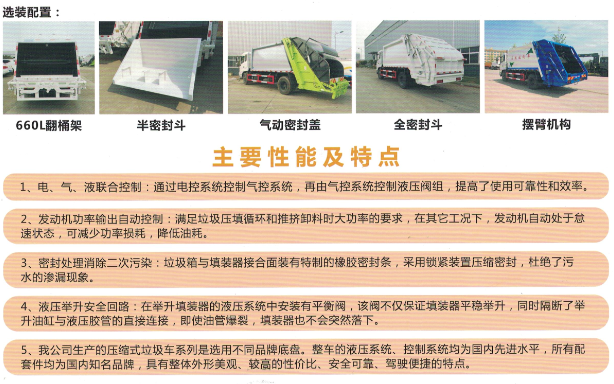 電氣、液壓系統(tǒng)的關(guān)鍵元器件均采用知名元件,如PLC、多路換向閥組、按鈕、油缸密封件等,提高了垃圾車的使用可靠性。