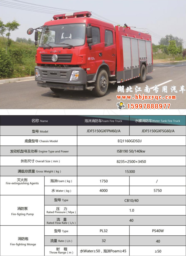 | 產(chǎn)品名稱: | JDF5150GXFSG60/A型水罐消防車 | 外型尺寸(mm): | 8235×2500×3450 |