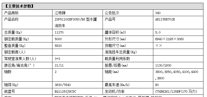 | JDF5110GXFSG50/E6型水罐消防車 產(chǎn)品主要技術(shù)資料 | |||