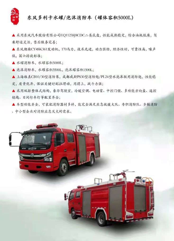 JDF5110GXFPM50/E6型泡沫消防車、JDF5110GXFSG50/E6型水罐消防車,采用東風EQ1125SJ8CDC底盤改裝而成。整車由消防員乘員室和車身兩大部分組成,乘員室為雙排,可乘坐3+3人,該車為外露罐結(jié)構(gòu),車身前部為器材箱,中部為水罐,后部為泵房。載液罐體為優(yōu)質(zhì)碳鋼,與底盤采用彈性連接,載水3400kg(PM50)/5000kg(SG50),泡沫液量1600kg(PM50),裝備了上海茸申消防設(shè)備有限公司生產(chǎn)CB10/30型低壓消防泵,額定流量30L/S,車頂安裝成都威斯特消防機械有限公司生產(chǎn)的PL24(PM50)或PS30W(SG50)型車用消防炮。該車輛結(jié)構(gòu)緊湊,配置完備,機動性強,能夠及時應(yīng)對企業(yè),社區(qū)或重點消防單位的火情,可以第一時間形成小型戰(zhàn)斗力進行初期火災(zāi)的撲救和人員疏散撤離?蓮V泛應(yīng)用于消防救援站,政府專職消防隊,企業(yè)專職消防隊等。