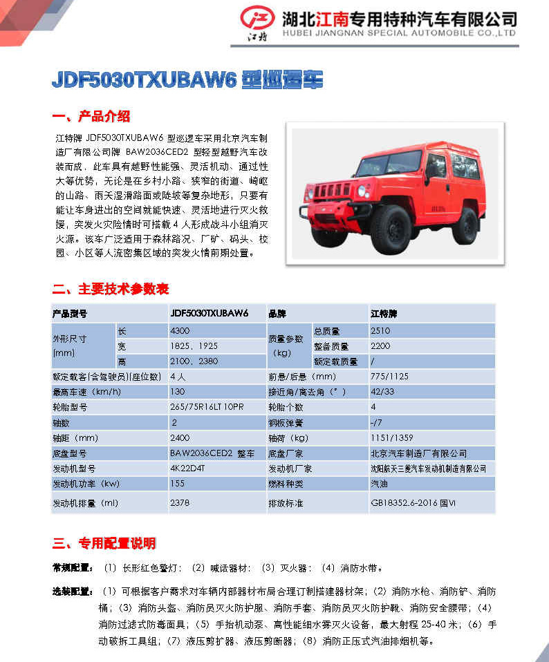 江特牌 JDF5030XYBBAW6 型運(yùn)兵車采用北京汽車制造廠有限公司牌 BAW2036CGD1 型輕型越野汽車改裝而成,該車主要用于突發(fā)自然災(zāi)害、突發(fā)安全事故或火災(zāi)等應(yīng)急搶險(xiǎn)人員輸送。廣泛適用于軍隊(duì)、公安特勤、醫(yī)療衛(wèi)生部門的自然 災(zāi)害搶險(xiǎn)、消防救援保障,以及石油、化工、天然氣、供水供電 等管道的檢測(cè)與搶修;還可運(yùn)用于高壓輸變電線路、高速公路、礦山等設(shè)備故障的搶修維護(hù)等人員輸送。