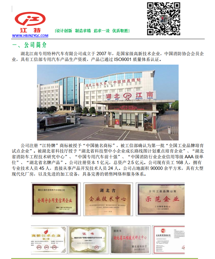 湖北江南專用特種汽車有限公司成立于2007年,注冊資本壹億元,坐落于隨州市北郊星光工業(yè)園特1號(316國道旁),占地150畝,擁有23000多平方米現(xiàn)代化廠房和10000平方米的綜合辦公樓,具備專用汽車生產(chǎn)資質(zhì)、消防車生產(chǎn)資質(zhì),是一家集研發(fā)、制造、銷售為一體的特種專用車改裝為主的高新技術(shù)企業(yè),“江特”牌注冊商標(biāo)被授予了“中國馳名商標(biāo)”