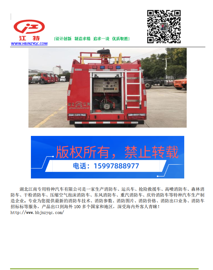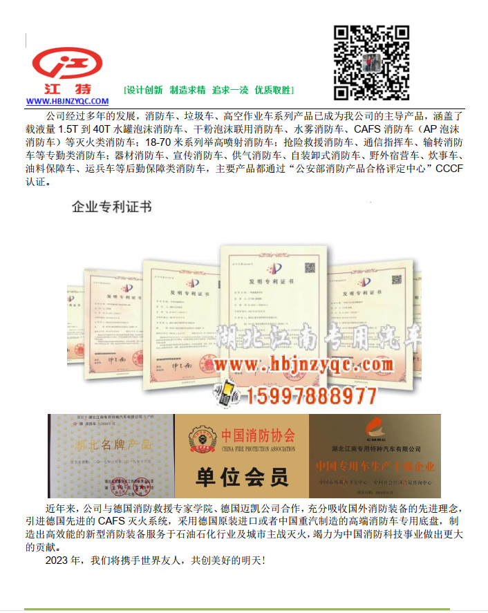 湖北江南專用特種汽車有限公司是一家生產(chǎn)消防車、運兵車、搶險救援車、高噴消防車、森林消防車、干粉消防車、壓縮空氣泡沫消防車、東風(fēng)消防車、重汽消防車、慶鈴消防車等特種汽車生產(chǎn)制造企業(yè)。專業(yè)為您提供最新的消防車技術(shù)、消防參數(shù)、消防圖片、消防價格、消防出口業(yè)務(wù)、消防車招標(biāo)標(biāo)等服務(wù),產(chǎn)品出口到海外100多個國家和地區(qū),深受海內(nèi)外客人青睞!http://billydanny.com/