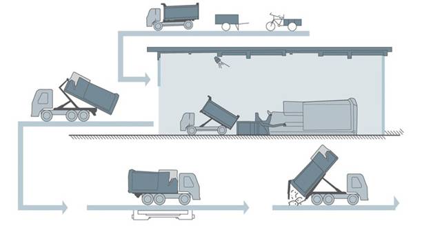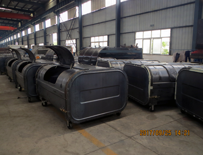 垃圾斗或?qū)S盟芰贤暗呐e升機(jī)構(gòu),可將容器內(nèi)的垃圾傾倒入壓縮機(jī)料斗及壓縮腔的機(jī)構(gòu);利用推缸油缸的往復(fù)運(yùn)動(dòng)驅(qū)動(dòng)推鏟推出、縮回,實(shí)現(xiàn)壓縮垃圾的功能。翻轉(zhuǎn)架裝置符合國家機(jī)械設(shè)計(jì)、負(fù)重機(jī)構(gòu)安全標(biāo)準(zhǔn)CJ/T29.2-79;所有運(yùn)動(dòng)副均采用了復(fù)合雙金屬軸承襯套,減摩降噪,運(yùn)轉(zhuǎn)平穩(wěn);垃圾桶翻轉(zhuǎn)架與投料口密封蓋聯(lián)動(dòng)操作,投料口密封蓋(上蓋)在翻桶時(shí)打開,在放桶時(shí)關(guān)閉。料斗有效寬度2400mm,容積3.0m3,適用于人工板車、三輪車和小型自卸車在內(nèi)的垃圾收集方式投料。效率比較高,是常用的翻轉(zhuǎn)形式。