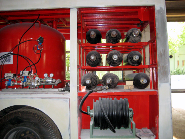 器材箱位于乘員室后部,兩邊設(shè)鋁合金卷簾門,內(nèi)有照明燈。器材箱內(nèi)安裝干粉罐,氮?dú)馄考案煞巯到y(tǒng)。 |