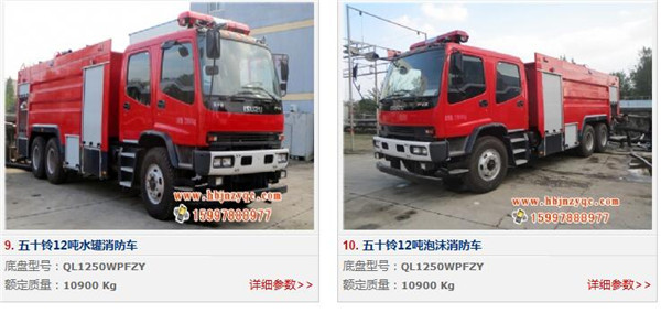重慶五十鈴12噸消防車:采用五十鈴700P底盤改裝而成,是在慶鈴QL1250WPFZY 底盤基礎上加裝上裝。載水8000kg(PM110)/10800kg(SG110),泡沫液量2800kg(PM160),裝備了上海雄真消防設備有限公司生產(chǎn)CB10/60-XZ型低壓消防泵,額定流量60L/S,車頂安裝成都威斯特消防機械有限公司生產(chǎn)的PL48(PM110)或PS60W(SG110)型車用消防炮。該車的特點是載液量大、操控性好、維修簡便?蓮V泛應用于公安消防隊、廠礦企業(yè)及社區(qū)、碼頭等場所,撲救大型油類火災或一般物質(zhì)火災。