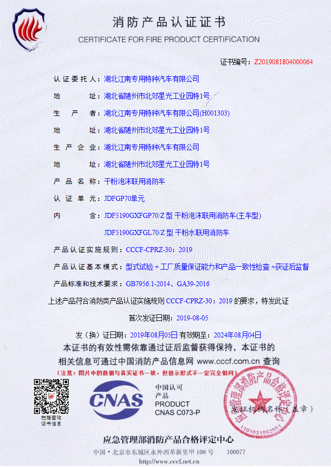 整車消防性能符合GB7956-2014標(biāo)準(zhǔn)要求;底盤通過(guò)國(guó)家強(qiáng)制性產(chǎn)品認(rèn)證;發(fā)動(dòng)機(jī)排放符合GB17691-2018第六階段限值的規(guī)定要求(國(guó)Ⅵ標(biāo)準(zhǔn));整車通過(guò)國(guó)家消防裝備質(zhì)量監(jiān)督檢驗(yàn)中心檢,已獲得應(yīng)急管理部CCCF認(rèn)證。