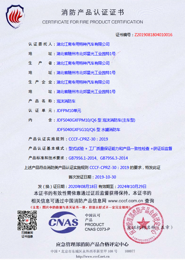 整車消防性能符合GB7956-2014標(biāo)準(zhǔn)要求;底盤通過(guò)國(guó)家強(qiáng)制性產(chǎn)品認(rèn)證;發(fā)動(dòng)機(jī)排放符合GB17691-2018第六階段限值的規(guī)定要求(國(guó)Ⅵ標(biāo)準(zhǔn));整車通過(guò)國(guó)家消防裝備質(zhì)量監(jiān)督檢驗(yàn)中心檢,已獲得應(yīng)急管理部CCCF認(rèn)證。
