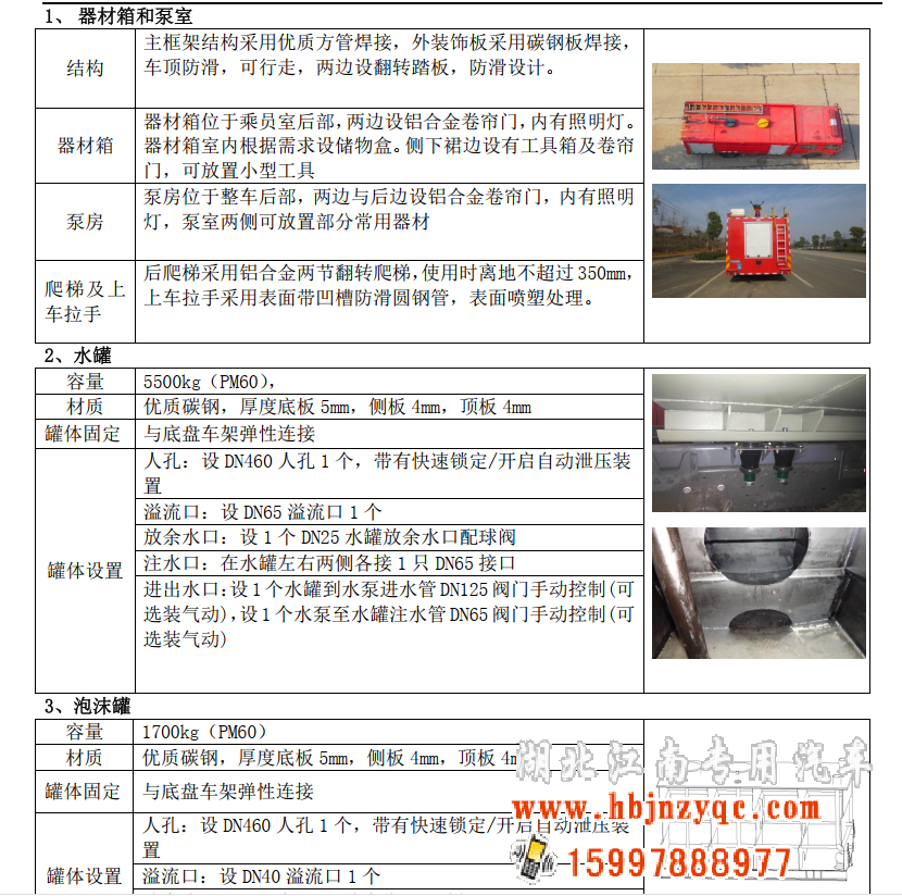 | 整車說明: | 罐體總?cè)莘e:7.200立方米,水罐容積:5.500立方米,水罐尺寸:1880×2440×1250mm,泡沫液罐容積:1.700立方米,泡沫液罐尺寸:1130×1250×1250mm。整體式側(cè)防護結(jié)構(gòu),后防護裝置材料:Q235,截面尺寸:120×120mm,與車輛連接方式:螺栓連接,后防護離地高度:435mm。ABS及控制器型號為:APG3550500H1,生產(chǎn)廠家為:浙江亞太機電股份有限公司;ABS控制器型號:ABS8.8 ECU 24V,生產(chǎn)廠家為:東科克諾爾商用車制動系統(tǒng)(十堰)有限公司。主要專用裝置有消防泵、消防炮。 | ||